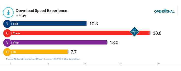 A velocidade, de acordo com a Open Signal, ficou praticamente inalterado em relação a versão anterior do relatório. A Claro aparece novamente na liderança, com média de 18,8 Mbps.