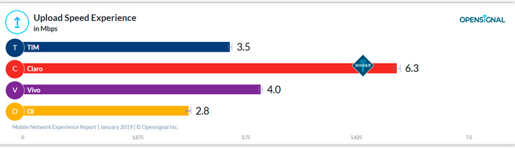 Assim como no download, a Open Signal atribui a vitória da Claro a sua poderosa rede LTE na América Latina. A operadora ficou com média de 6,3 Mbps, mais de 2 Mbps acima da segunda colocada, a Vivo, com 4,0 Mbps.