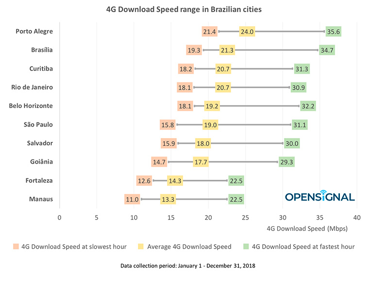 Dados coletados pela própria Open Signal, entre 1º de janeiro a 31 de dezembro de 2018, revelam que a média de velocidade em Porto Alegre foi de 24 Mbps, enquanto Manaus foi 13.3 Mbps.