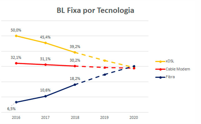 A estimativa é que os acesso por fibra (FTTx), que representavam apenas 6,5% da quota de mercado em 2016, supere a marca de 30% em 2020, ultrapassando o xDSL e o cable modem.