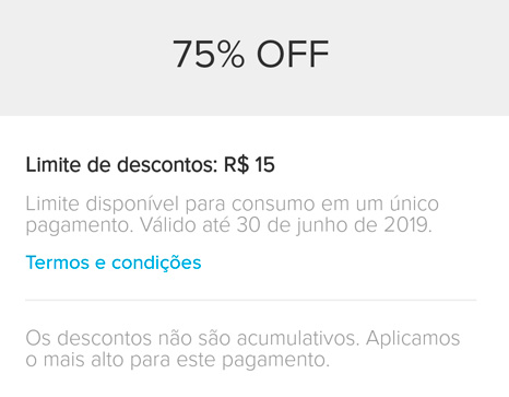 Para novos usuários, que nunca fizeram recarga, está sendo oferecido até o dia 30 de junho, 75% de desconto – limitado a R$ 15.