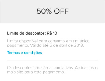 Para aqueles que já estão acostumados a utilizar o aplicativo do Mercado Pago segue o tradicional 50% de desconto, limitado a R$ 10. O desconto é válido até o dia 06 de abril.