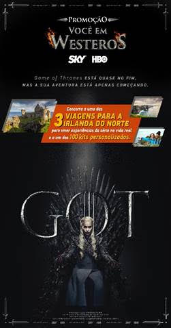 Além disso, pelo mesmo site da campanha, os assinantes Pós-Pago que possuem os canais HBO em seu pacote podem se inscrever até o dia 7 de junho para entrar na disputa por uma viagem, com tudo pago, para ver de perto os locais que serviram de cenário para a série Game of Thrones, na Irlanda do Norte. Serão três ganhadores, com um acompanhante cada. A promoção ainda vai sortear 100 kits exclusivos com boné, camiseta, caneca, pop socket e sacochila personalizadas de GoT para os clientes.