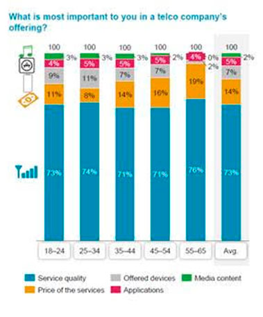 Para 73% dos brasileiros ouvidos pelo levantamento da Oliver Wyman a qualidade dos serviços é o item mais importante em uma empresa de telecom. O custo do serviço vem em segundo lugar (14%), seguido por oferta de dispositivos (7%), oferta de aplicativos (5%) e oferta de conteúdo (2%).