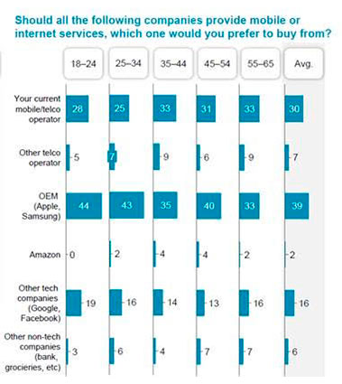 Sobre empresas que fornecem serviços de tecnologias móveis ou de internet: 39% disseram preferir adquirir serviços da Apple e Samsung, 30% citaram a atual operadora de celular e 16% comparariam de outras empresas de tecnologia como Google e Facebook.