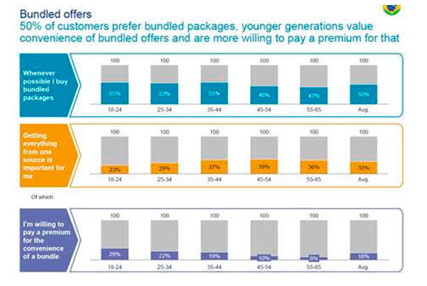 Em relação aos modelos de contratos das operadoras, segundo o levantamento da Oliver Wyman, 50% tem preferência por pacotes de serviços. Para 33% é importante comprar todos os serviços de um único fornecedor e 18% dizem estar dispostos a pagar um pouco mais pela conveniência de um pacote.