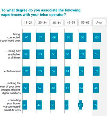 Quando perguntados sobre quais experiências mais relevantes que estariam associadas aos serviços prestados pelas operadoras, 63% citaram a conexão com os familiares, 55% apontaram os serviços disponíveis em todos os momentos, 52% indicaram preferência por entretenimento, 46% disseram otimizar o seu tempo com as soluções digitais e 35% valorizam as experiências de controlar a sua residência à distância com dispositivos inteligentes.