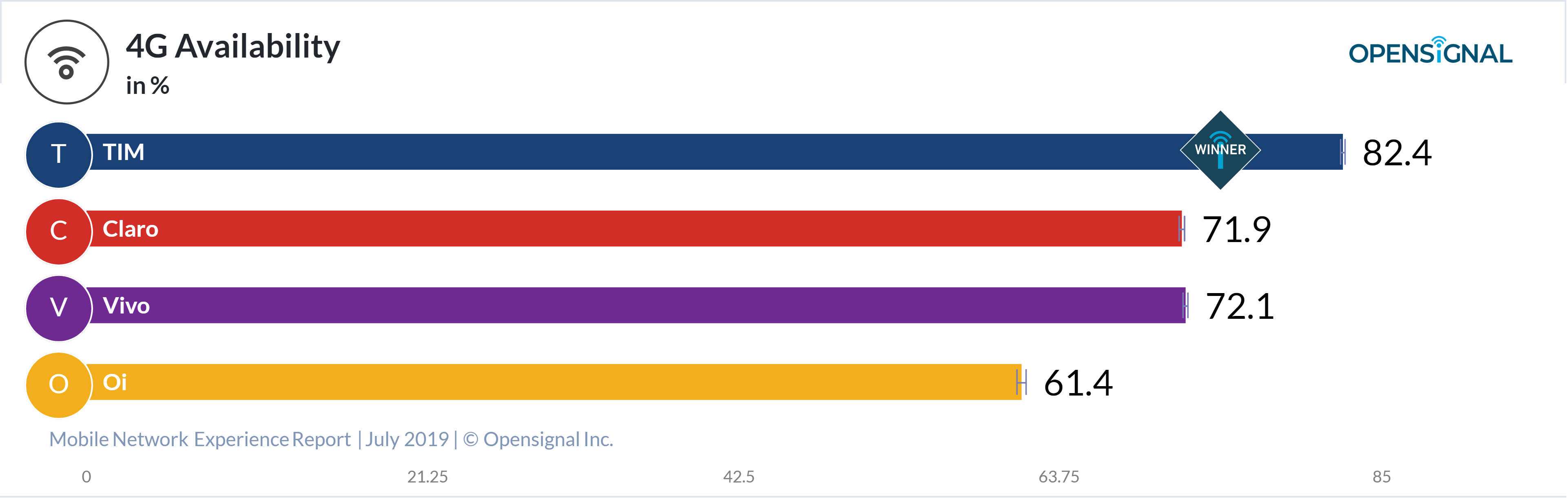As principais operadoras brasileiras entraram na análise: Claro, TIM, Vivo, Oi e Nextel. A TIM, mais uma vez, está em vantagem. Atingiu a marca dos 80% na disponibilização do sinal 4G. A latência da operadora também é destaque, isso significa que ela é uma das melhores em transmissão de vídeo e áudio.