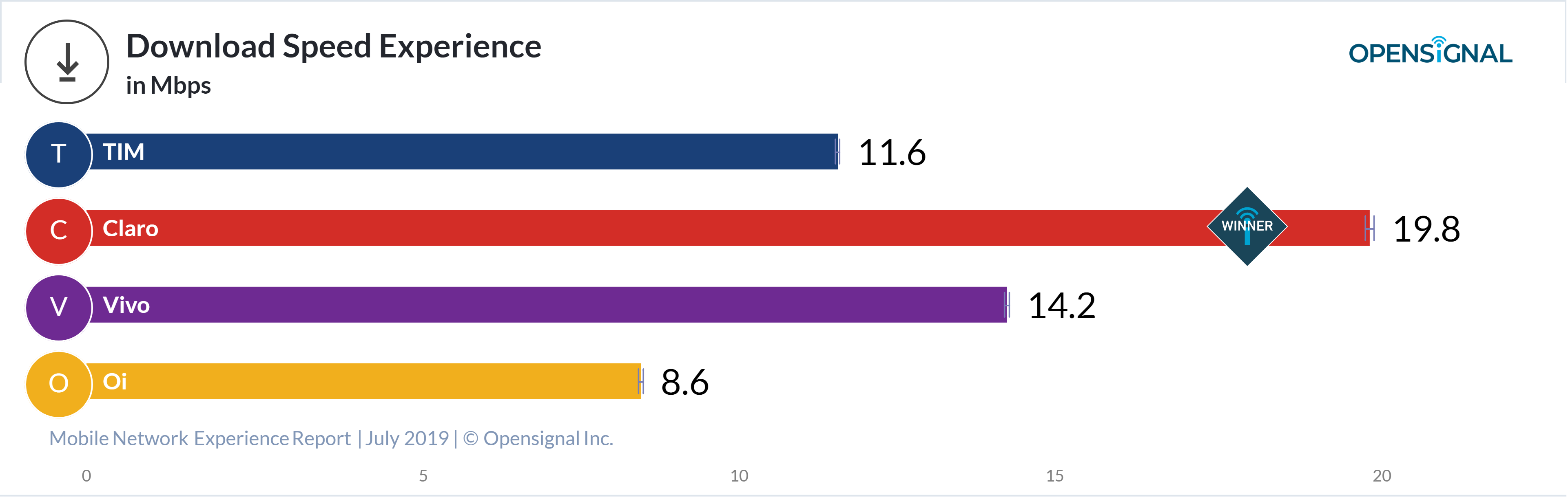 Na medição de velocidade de download, chegou a vez da Claro vencer a disputa. A média registrada foi de 19,8 Mbps. Em segundo, surge a Vivo com 14,2. TIM e Oi seguem longes da liderança. A primeira atingiu 11,6 Mbps e a segunda ficou com 8,6.
