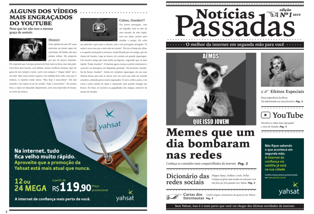 No conteúdo, um jornal é mostrado com várias notícias, mas todas elas bem antigas e ultrapassadas, conforme mostra a imagem abaixo. No espaço de anúncio da marca, as seguintes frases constroem o sentido da ação: “Na internet, tudo fica velho muito rápido”, “Não fica sabendo o que acontece em segundo mão”.