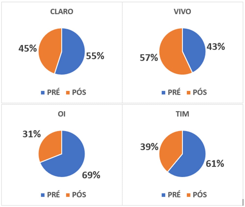 Entretanto, clientes pré-pagos ainda representam 55% da base da operadora. A Vivo é a que mais detém clientes pós, que representam 57% no seu total de consumidores. A TIM fica com 39% e a Oi 31%.