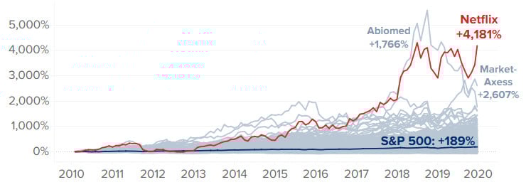 Nos últimos 10 anos, a Netflix não apenas revolucionou a indústria do entretenimento, mas também teve um bom desempenho no mercado de ações. Desde o final de 2009, a empresa viu seus papéis na bolsa valorizam 4.181%, na cotação da última sexta-feira, 27.
