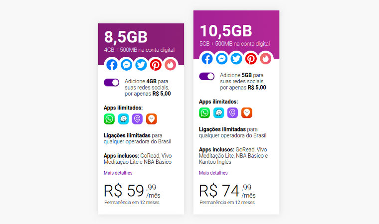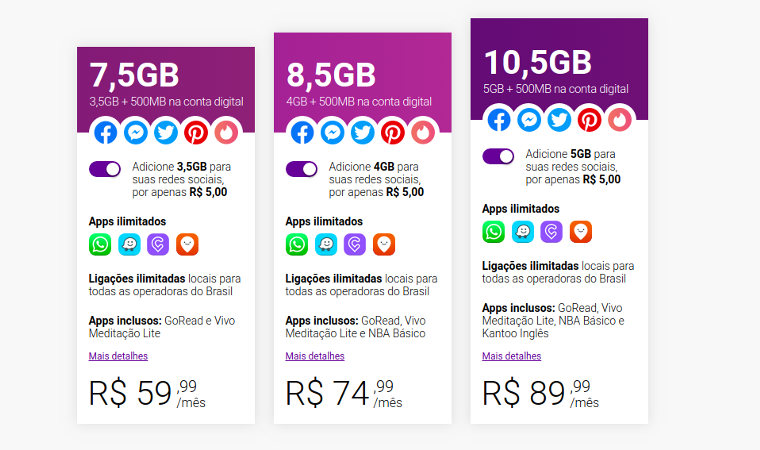 Ao adquirir o plano de 4GB, o cliente que optar pela conta digital recebe mais 500MB e paga R$ 54,99 por mês. Se o usuário escolher desembolsar mais R$ 5, ele ganha mais 4GB para usar em redes sociais, totalizando 8,5 GB, tudo por R$ 59,99 mensais.