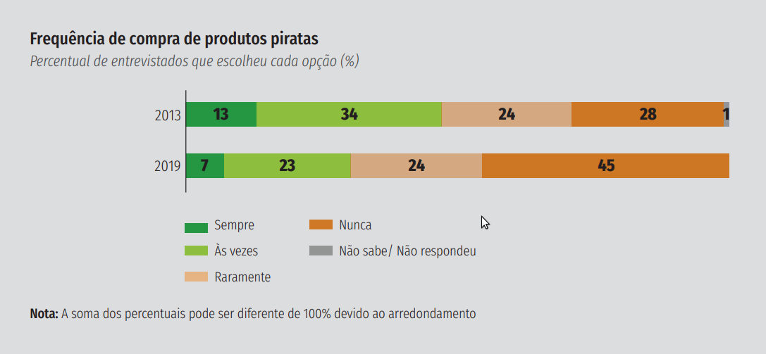 Segundo a CNI, entre 2013 e 2019, o percentual de brasileiros que afirmam que nunca compram produtos piratas aumentou de 28% para 45%. Para aqueles que dizem que compram às vezes, a queda foi de 34% para 23%. Já a taxa de usuários que afirmam que adquirem produtos ilegais foi de 13% para 7%.