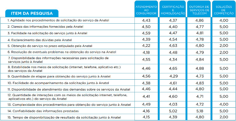 O serviço de “outorga de serviços de telecom” da Anatel apresentou o maior índice de satisfação, com pontuação 4,82, próximo da condição de “muito satisfeito”. Já as “soluções de competição”, teve a menor nota (4,27), mais próximo ao grau de pouca satisfação.