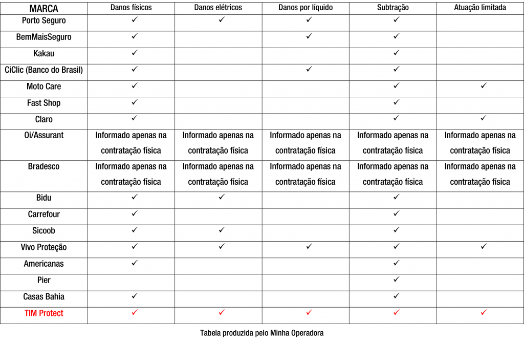 A TIM também possui uma cobertura completa, mas o nome da operadora aparece em vermelho, pois o seguro oferecido não está disponível para novas adesões, apesar de ainda ter contratos em vigência.