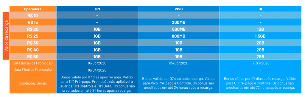 Os dados móveis serão concedidos para clientes pré-pagos e controle, com exceção da TIM, que considera apenas seus clientes pré, sem incluir o TIM Beta. Abaixo, confira a tabela: