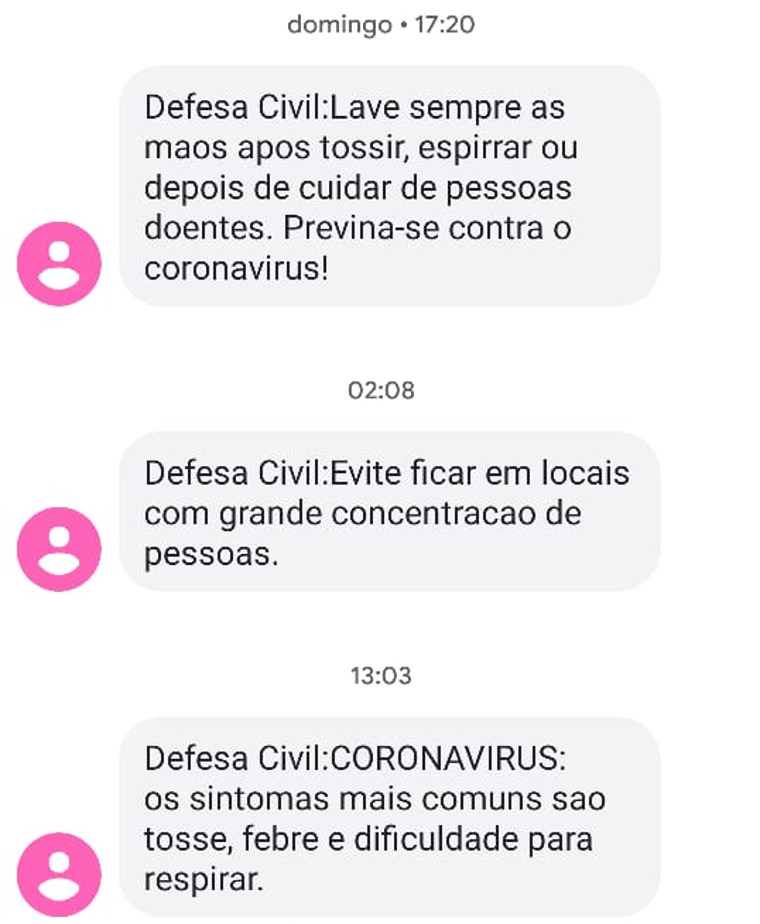 Desde o último domingo, 15, os usuários do estado de São Paulo, cadastrados no serviço de mensagens de alertas da Defesa Civil, estão recebendo torpedos SMS com orientações e dicas sobre como se prevenir da infecção do novo coronavírus.