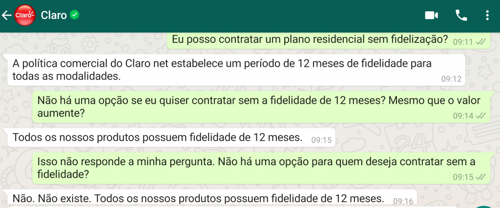 No entanto, a Claro não parece interessada em fechar contratos de usuários que não querem se fidelizar a uma empresa. O relato foi enviado por um consumidor ao Minha Operadora, com uma série de prints do atendimento prestado.