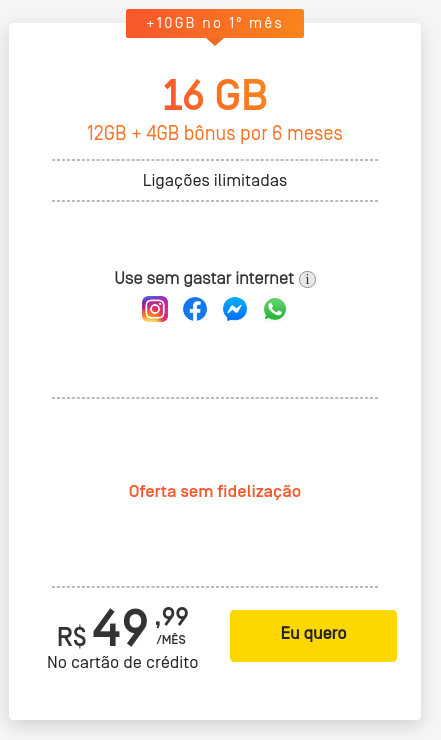 Além disso, o plano é isento de fidelização. Ou seja, não há tempo de permanência mínimo ou multa de cancelamento.