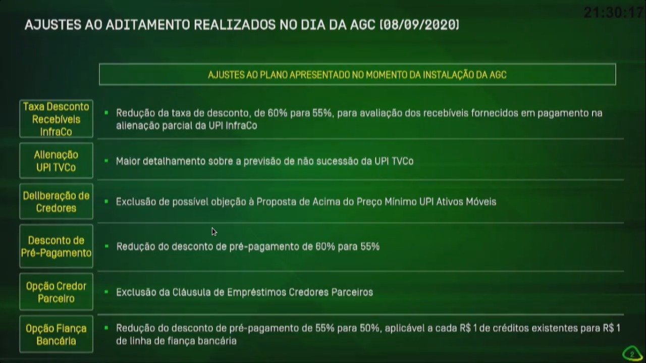 Após sete horas de negociações, a pedido dos bancos, a Assembleia Geral de Credores (AGC) foi retomada às 20h30, com as ressalvas de Paulo Penalva, advogado da Oi, lembrando a impossibilidade jurídica de adiar a presente assembleia, como queria o Itaú, Caixa e Banco do Brasil, pois isso estaria descumprindo uma decisão da Justiça.
