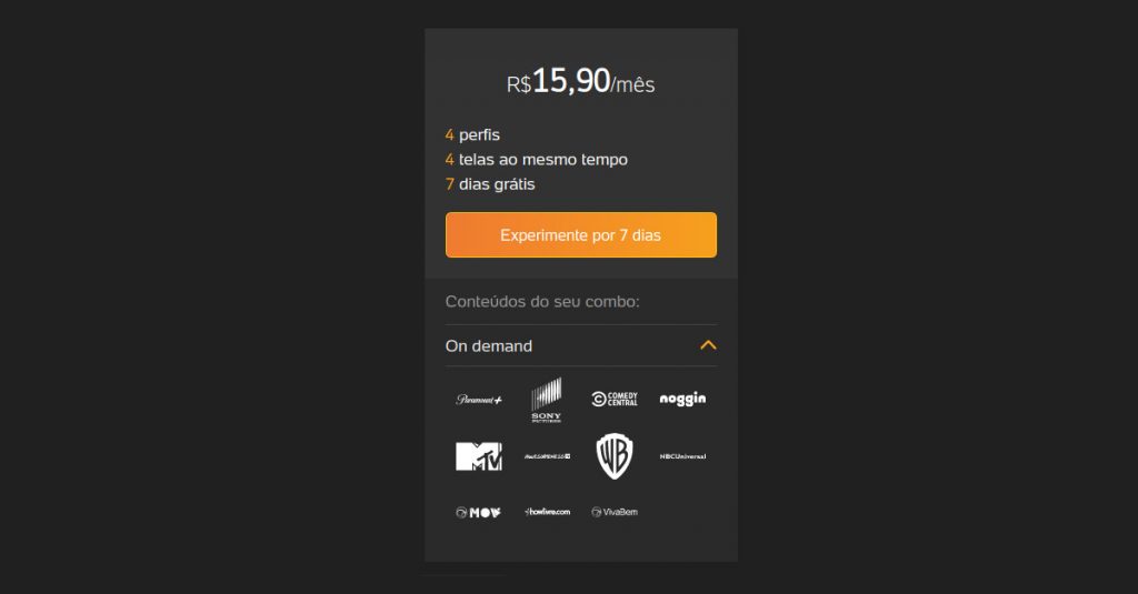 O plano inclui conteúdos sob demanda da Paramount+, Sony Pictures, Comedy Central, Noggin, MTV, Awesomeness TV, Warner Bros, NBC Universal e Showlivre.com.