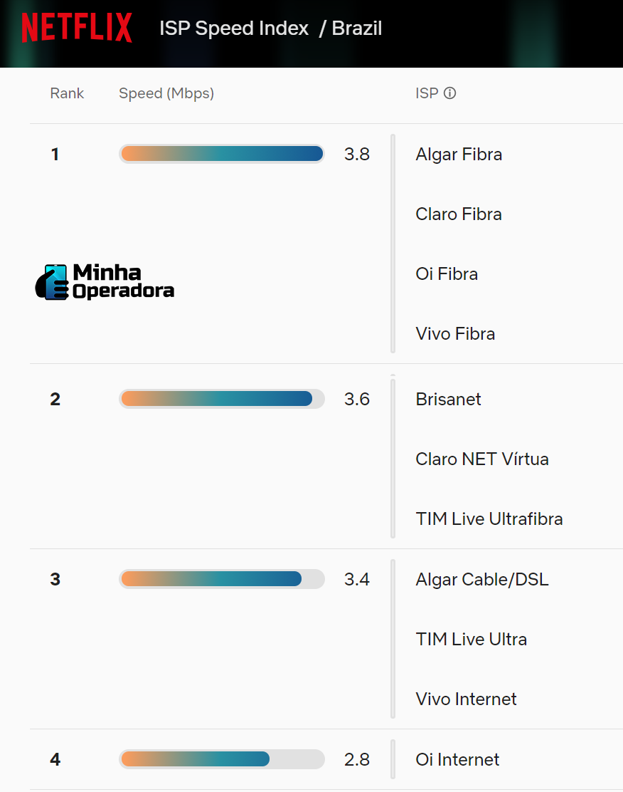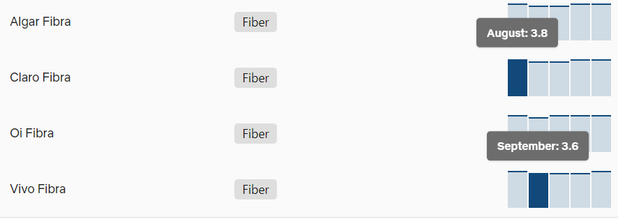 São elas: Oi Fibra, Algar Fibra, Claro Fibra e Vivo Fibra. Já o grupo 2 é encabeçado pela Brisanet, Claro NET Vírtua e TIM Live Ultrafibra, que ficam com uma média de 3.6 Mbps.