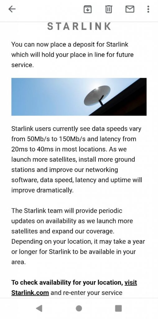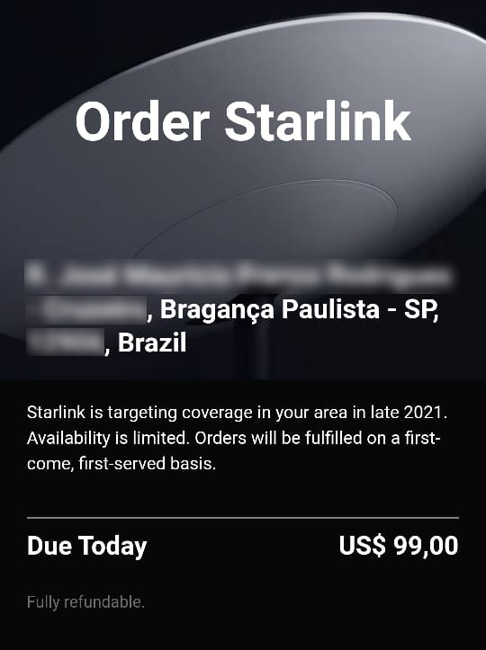 Usuários que já haviam se cadastrado no site da Starlink estão recebendo mensagens pedindo para checar novamente a disponibilidade do serviço em seus endereços e fazer o pagamento de uma taxa – a qual garante a presença na fila para uso da internet da empresa no futuro.