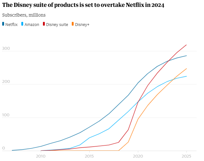 Um relatório divulgado pela consultoria Ampere Analytics revela que os serviços de streaming da Disney devem ultrapassar a Netflix em número de assinantes até 2024.