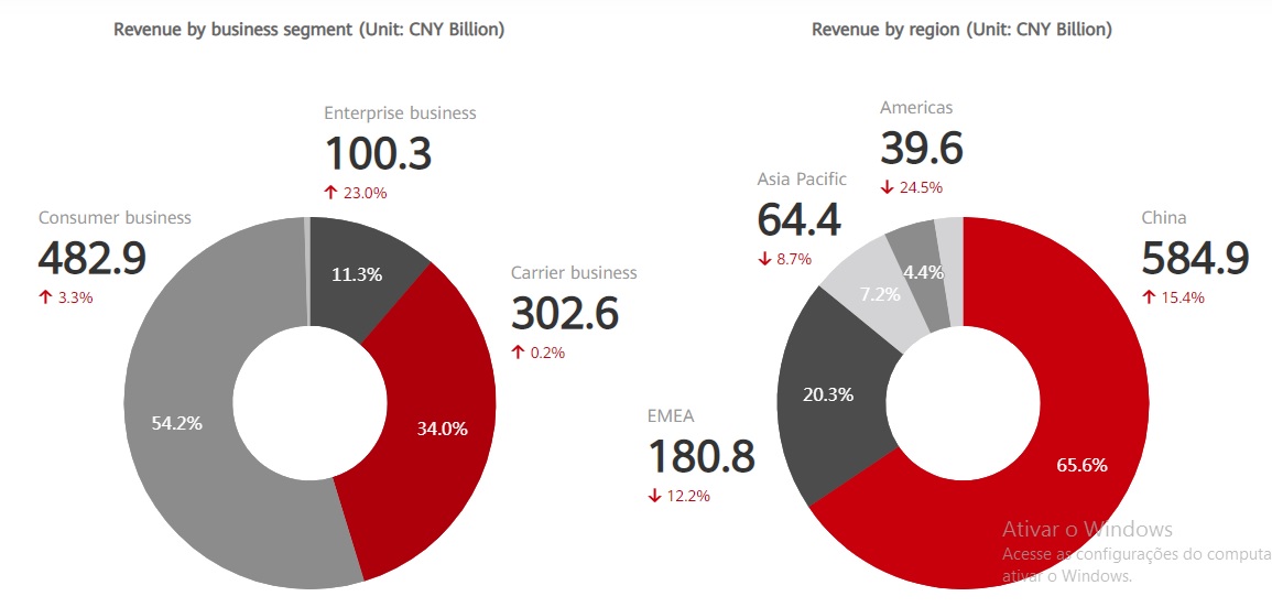 O pior desempenho da Huawei foi nas Américas, onde o declínio foi de 24,5%. Na sequência, aparecem a Europa, Oriente Médio e África, onde a empresa registrou queda de 12,2% e, em seguida, vem a Ásia, com 8,7%.