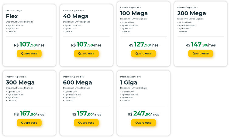 Além da velocidade de 1 Gbps, a Algar Telecom comercializa planos com outras velocidades, conforme a seguir: