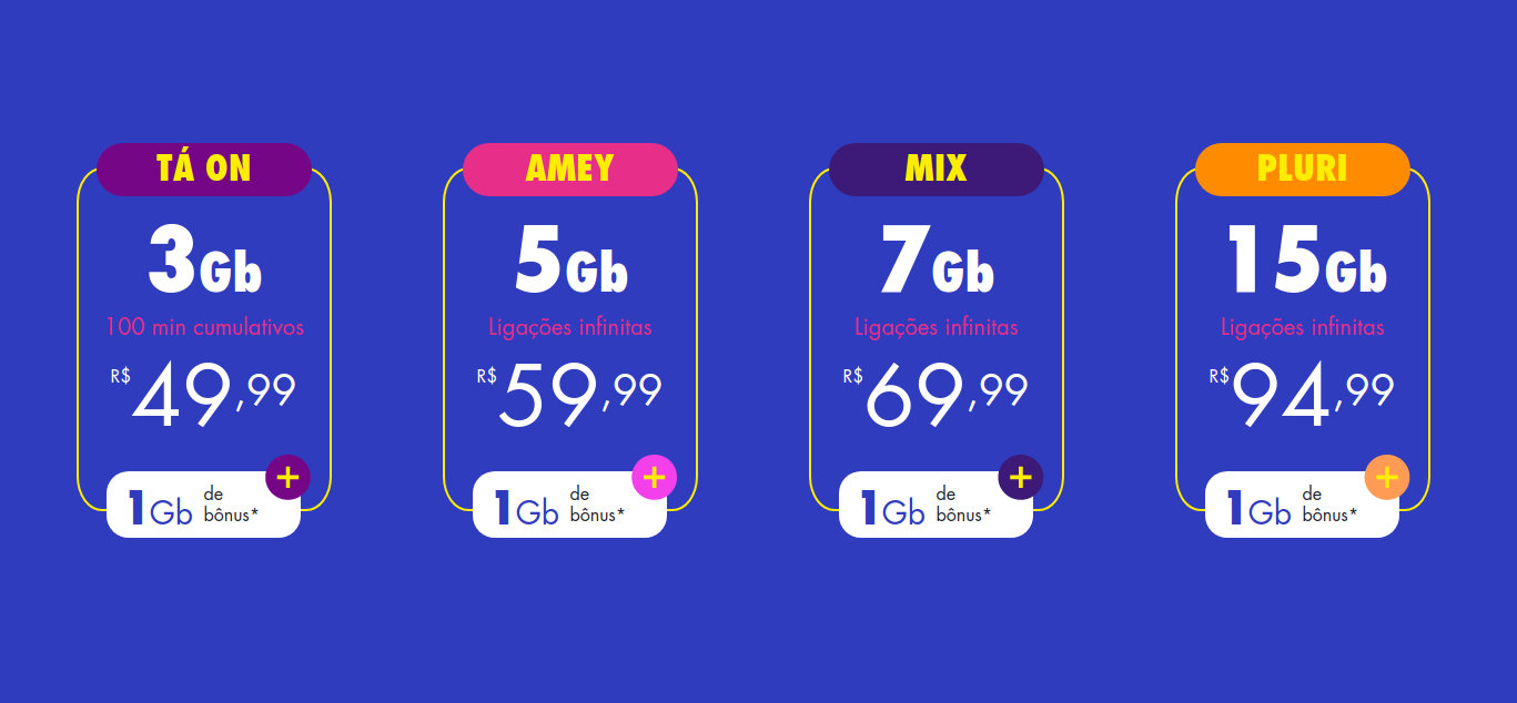 - Tá On: 3GB de dados e 100 minutos de ligações, por R$ 49,99