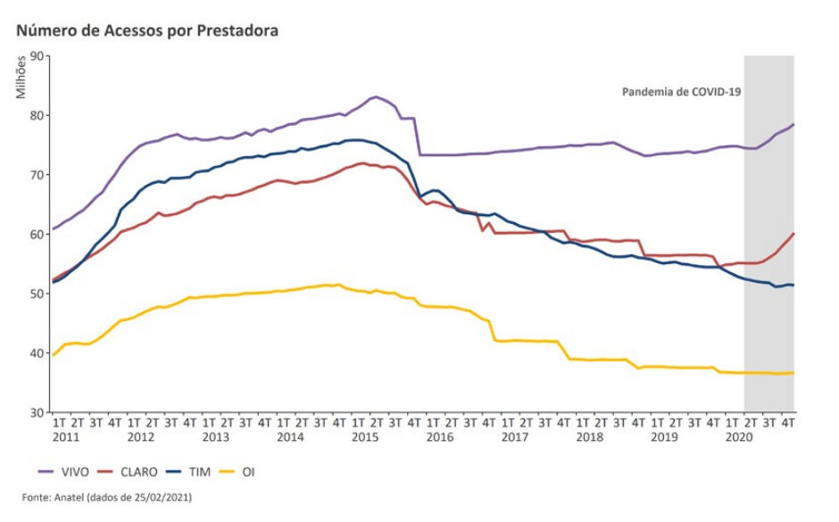 Além da TIM, a Oi também apresentou uma leve redução no número de acessos, variando 36,79 milhões para 36,65 milhões, ao final dos anos de 2019 e 2020, respectivamente.