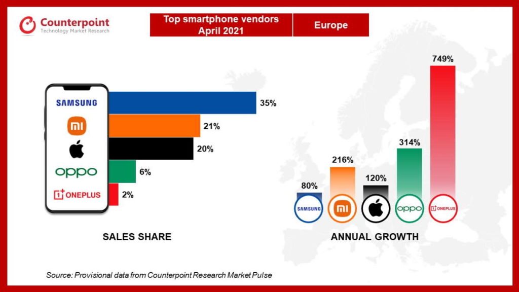 Ao comparar com o mesmo período de 2020, Xiaomi teve um crescimento de 216%, enquanto a Oppo avançou 314% e a OnePlus decolou com quase 750% de crescimento em vendas.