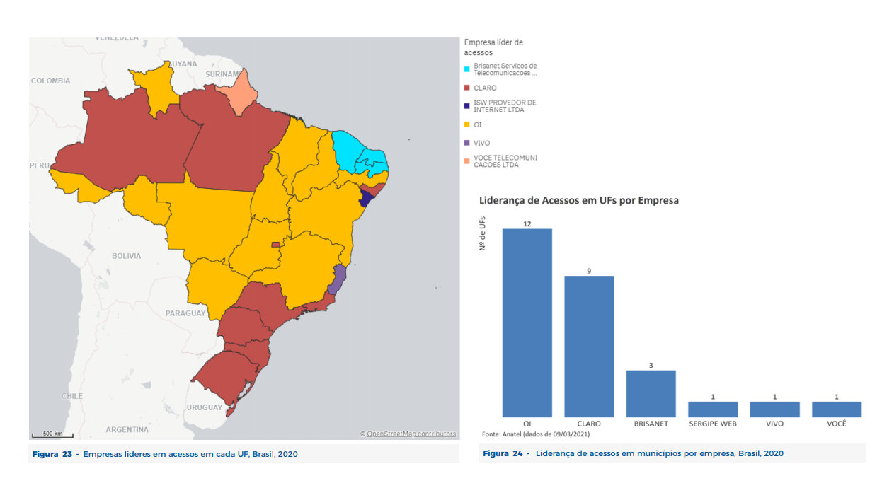 Quando o recorte é feito por liderança de acessos por estados, a Oi lidera em 12 deles: Roraima, Acre, Rondônia, Mato Grosso, Mato Grosso do Sul, Goiás, Tocantins, Minas Gerais, Bahia, Pernambuco, Piauí e Maranhão.