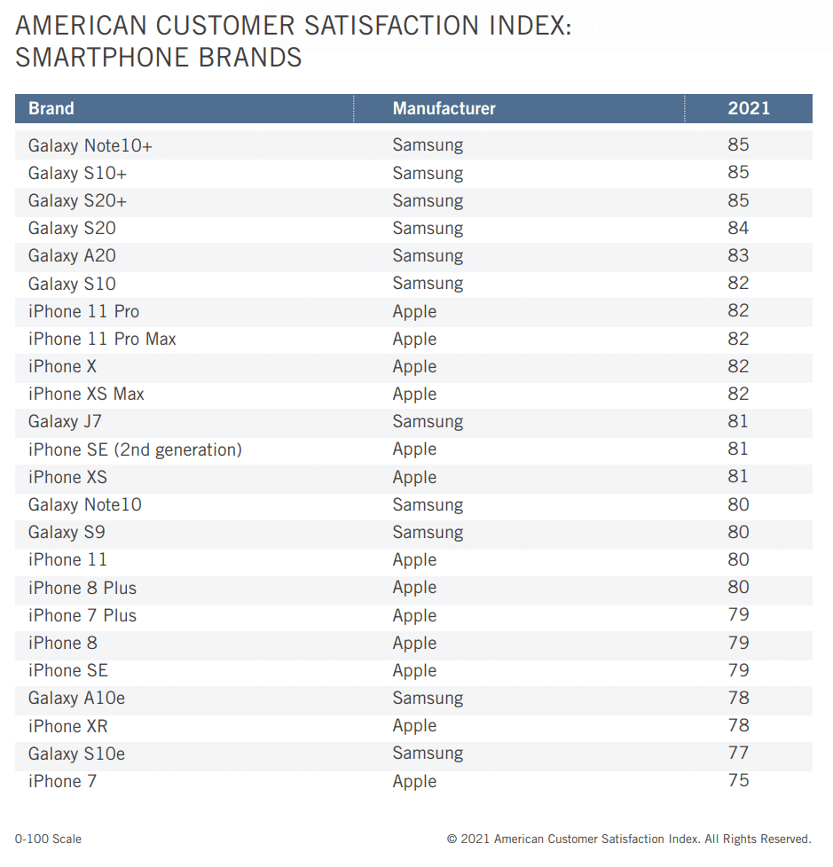 O American Customer Satisfaction Index (ASCI), algo como “índice de satisfação do consumidor norte-americano”, de 2021 aponta que usuários de aparelhos Samsung estão mais satisfeitos do que quem usa um iPhone da Apple.