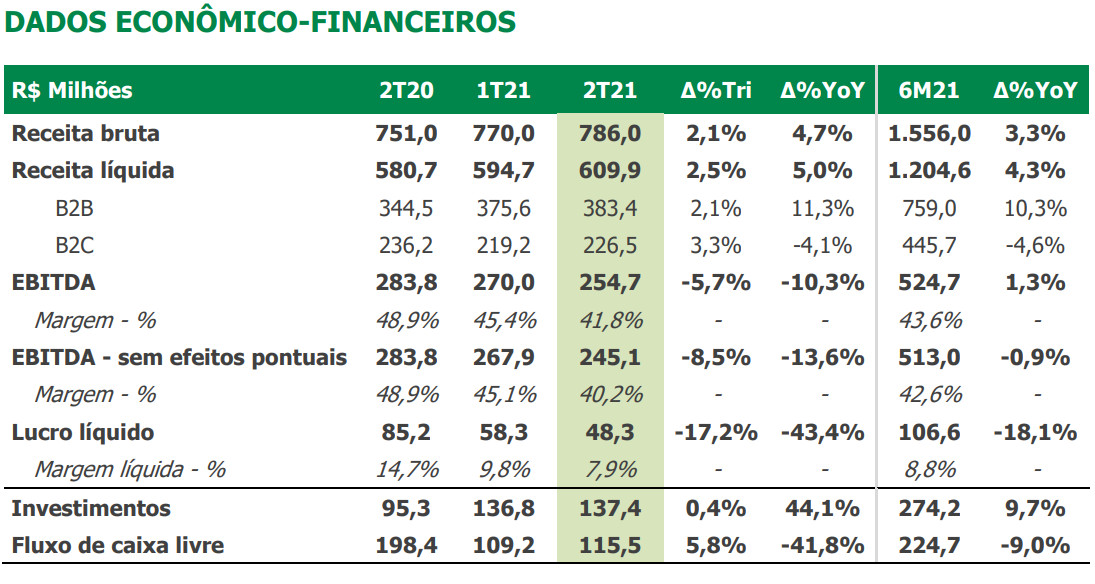 Na receita líquida, a operadora registrou R$ 609,9 milhões, alta de 5,0%. O resultado foi puxado principalmente pelos serviços prestados para clientes corporativos (B2B), que teve alta de 11,3%, somando R$ 383,4 milhões em receitas. No serviço prestado ao consumidor final (B2C), houve uma queda de 4,1%, totalizando R$ 226,5 milhões.