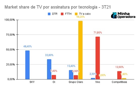 Embora o Grupo Claro tenha a liderança no market share em TV por assinatura no terceiro trimestre de 2021, quando se trata do tipo de tecnologia utilizada, a operadora não consegue se manter como líder no ranking. No segmento, é possível encontrar TV paga por DTH, FTTH e TVC. Em cada uma, há rankings de quantidade de acesso e de market share.