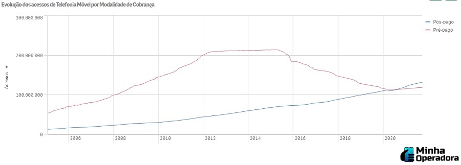 Outro aspecto que o relatório também aponta é o crescimento que a modalidade de pagamento pós-pago, que tem crescido desde 2018, enquanto que o pré-pago tem caído, se recuperando a partir de 2020. Em 2020, o pós chegou a ultrapassar o pré em acessos à telefonia móvel.