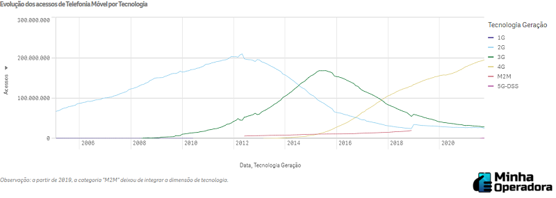 Outro ponto importante que pode ser observado no relatório da Anatel é o crescimento que a tecnologia 4G tem apresentado em referência ao 1G, 2G e 3G.