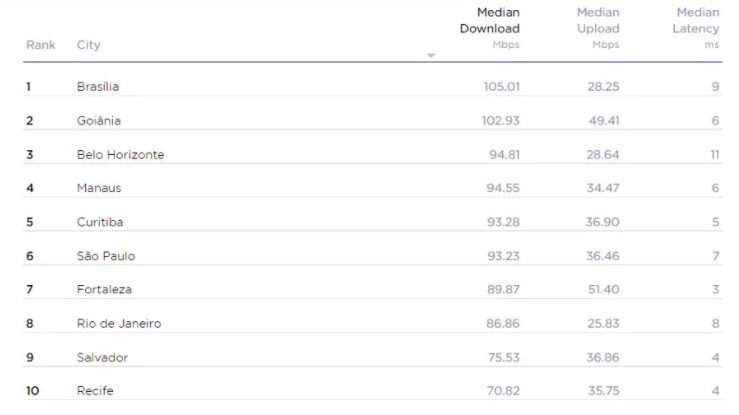 O Speedtest da Ookla também apontou os dados de velocidade nas capitais brasileiro, identificando em Brasília, a velocidade mediana mais alta, de 105 Mbps.