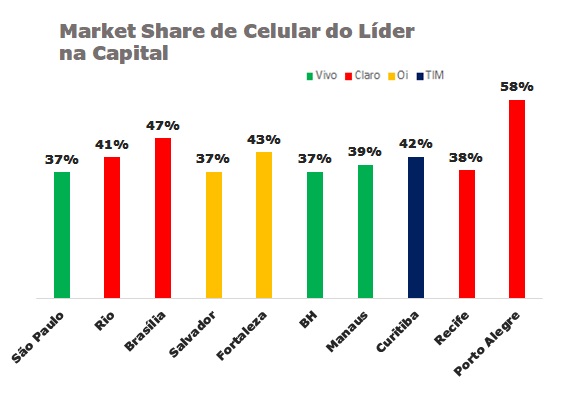 A Claro é líder no Rio de Janeiro, Brasília, Recife e Porto Alegre. Na capital carioca, a operadora possui o market share de 41,4% e foi a única a ganhar participação no mercado nos últimos 12 meses. A Vivo assume a vice-liderança com 23,4%, superando a TIM com 21,6%. O Rio de Janeiro tinha 9,7 milhões de celulares, sendo 60,4% pós-pagos.