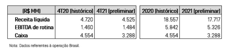 Os dados preliminares divulgados mostraram piora da operação, exceto o Ebitda (lucro antes de juros, impostos, depreciação e amortização) do quarto trimestre de 2021. Já a receita líquida caiu tanto no quarto trimestre de 2021 quanto no ano inteiro.