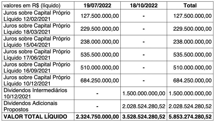 Desse valor, R$ 2 bilhões serão distribuídos em dividendos para quem tinha ações da empresa na data de 26 de abril. Enquanto que o restante de juros sobre capital já foram concluídos ao longo dos últimos doze meses.