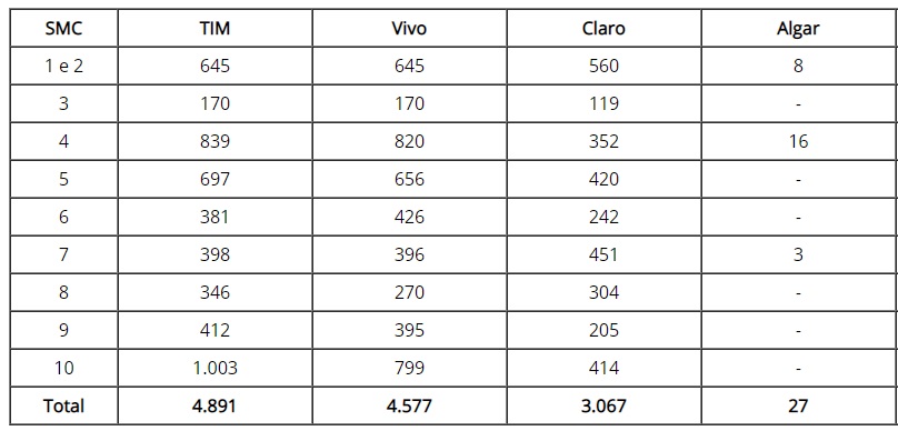 Confira na imagem abaixo quantos municípios cada operadora possui cobertura 4G nas regiões com SMC. Para se basear, use o mapa que demarca as regiões.