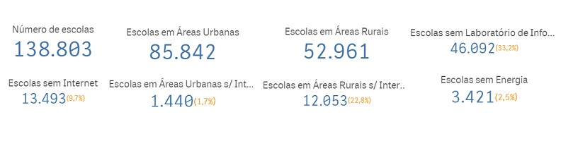 Já na página inicial do painel, podem ser encontradas informações sobre a quantidade total de escolas públicas federais, estaduais e municipais de educação básica em atividade; o número total de escolas urbanas e rurais; o número de escolas sem internet, tanto urbanas quanto rurais; o número de escolas sem laboratório de informática; e o número de escolas sem energia elétrica.