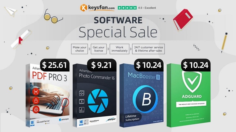 A Keysfan também oferece uma ampla seleção de software de ferramentas de computador, incluindo jogos de última geração, software antivírus de segurança, software de edição de vídeo e uma variedade de outros aplicativos e programas. Você pode se beneficiar de incríveis ofertas de baixo custo em softwares famosos que eles oferecem como Ashampoo PDF Pro 3 ou IObit Driver Booster 9 Pro!