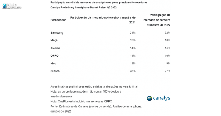 A Apple foi a única empresa das cinco primeiras em participação no mercado que registrou crescimento positivo. Já Xiaomi, OPP e Vivo seguem com uma operação mais cautelosa, elas possuem 14%, 10% e 9% de participação no mercado global.