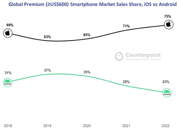 Entre as OEMs (Fabricante de Equipamentos Originais), as vendas da Apple cresceram 6% ano a ano no mercado premium, ampliando sua participação para capturar três quartos do total de vendas no segmento. Além disso, a empresa ainda teria crescido mais, se não fosse interrupção do fornecimento do iPhone 14 Pro e Pro Max durante o pico da temporada de férias em 2022. O declínio da Huawei na China também contribuiu.