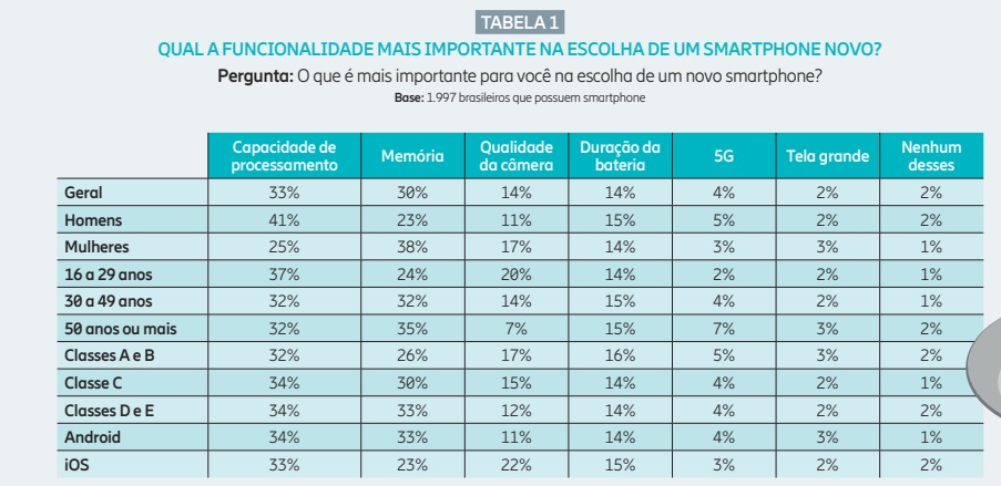 Considerando a faixa etária e as principais funcionalidades procuradas nos aparelhos, a pesquisa aponta que a qualidade da câmera é mais valorizada pelos jovens de 16 a 29 anos (20%) que pelos grupos de 30 a 49 anos (14%) e de 50 anos ou mais (7%). Na busca por memória, o resultado é invertido, os mais velhos (35%) se importam com essas características, em comparação com aqueles de 30 a 49 anos (32%) e os jovens de 16 a 29 anos (24%).